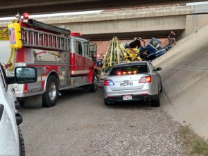 According to officers on scene following the accident, the truck was driving North on the highway. The driver was pinned behind the steering wheel after the truck went off the freeway between an overpass and ended up hitting the concrete underneath. First responders were able to get him out of the cab of that truck and into an ambulance.