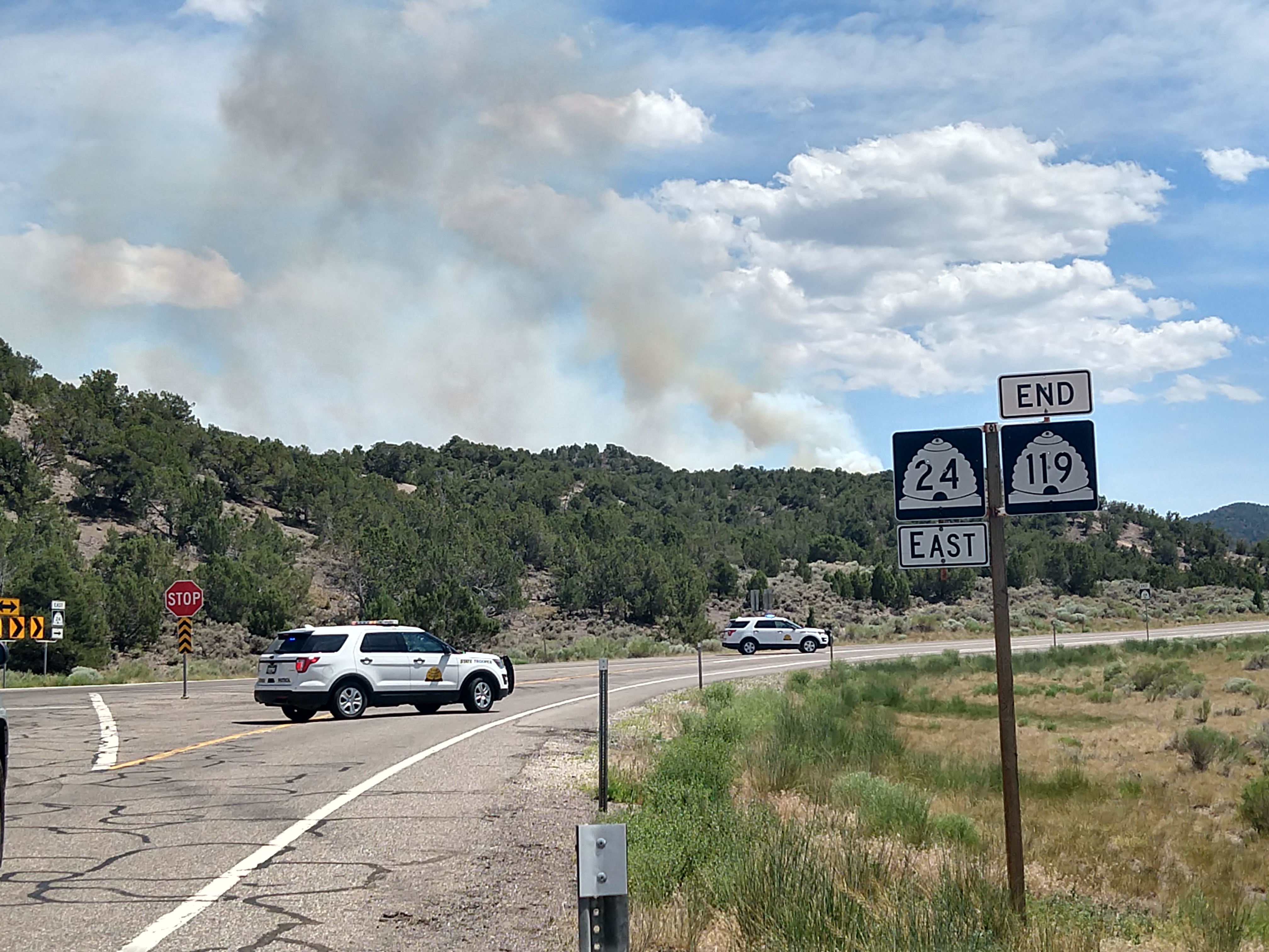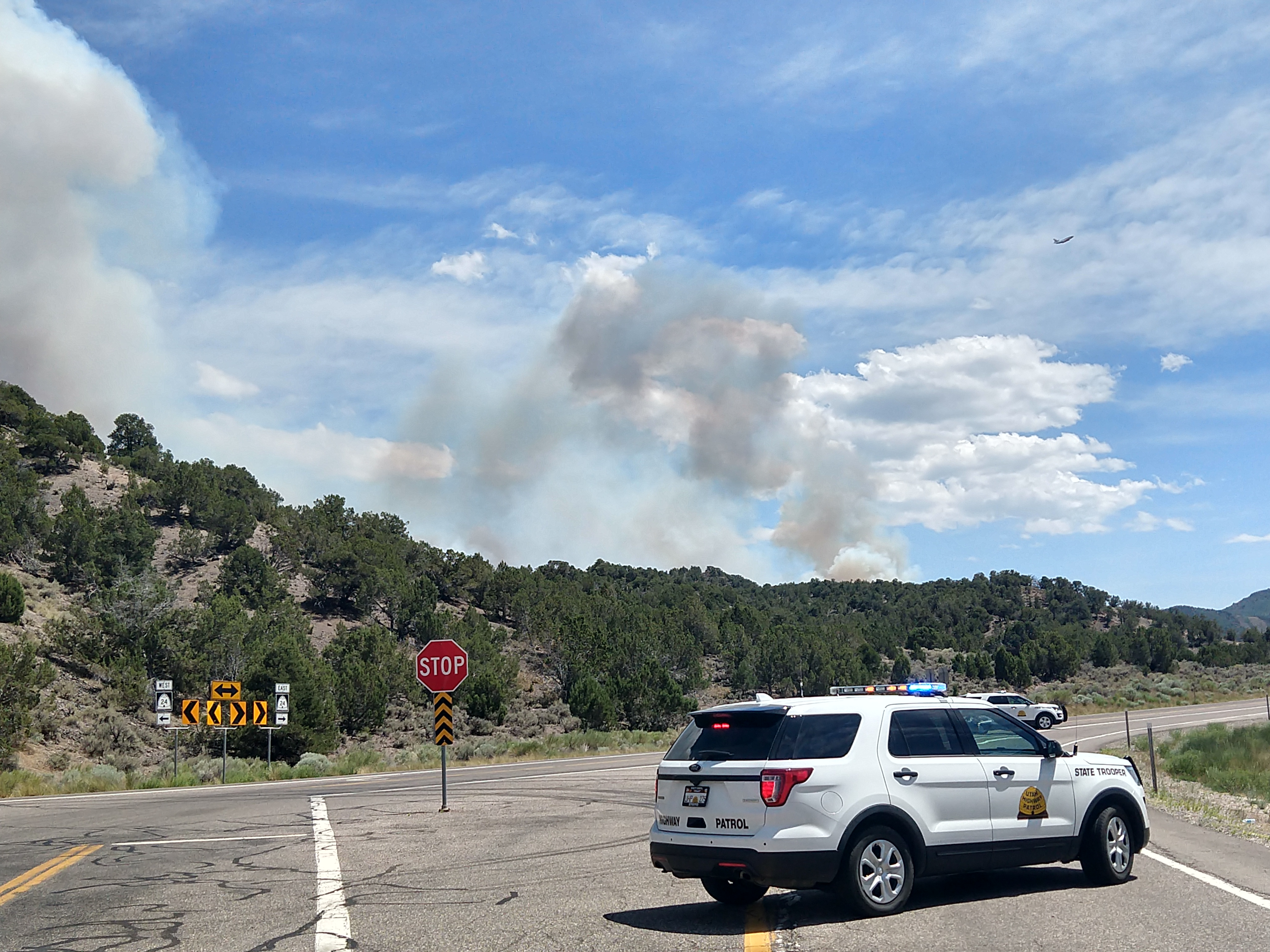 According to Utah Highway Patrol, the fire keeps jumping the highway, which is making it difficult to battle the blaze.