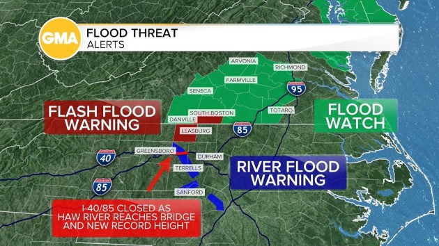 (CHATHAM COUNTY, N.C.) — Crews in North Carolina are “overwhelmed” with water rescues and search efforts on Monday after Chantal, then a tropical storm, made landfall a day earlier, causing record-breaking flooding in the central part of the state and at least one death, officials said.