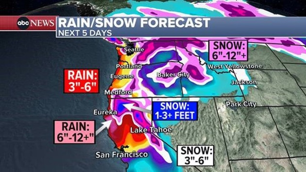 Rain totals could surpass 1 foot in Northern California and southern Oregon. More than 3 feet of snow is possible in the higher elevations.