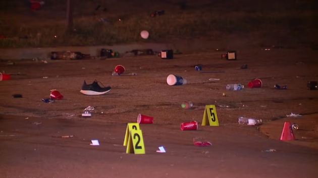 Police investigate a mass shooting that erupted on June 2, 2024, that left one man dead and 28 people injured at a large street party in Akron, Ohio. (ABC News/WEWS)